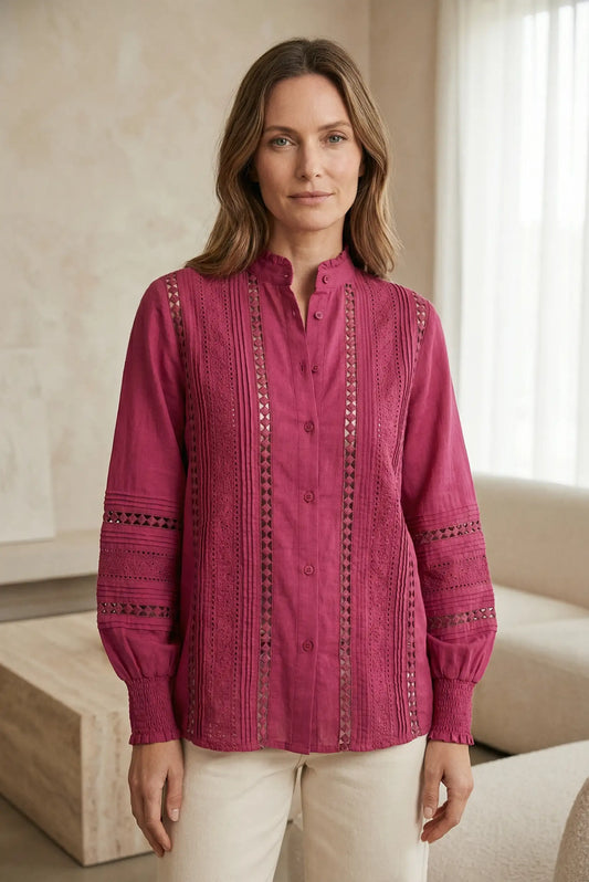 Blusa Cereza intensa manga larga calada con cuello mao primavera