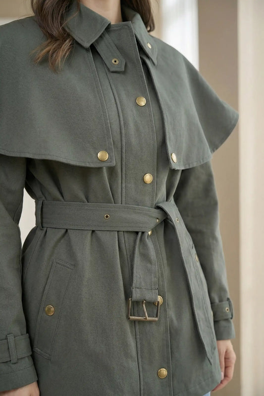 Abrigo corto mujer verde oliva con capucha y cinturón elegante