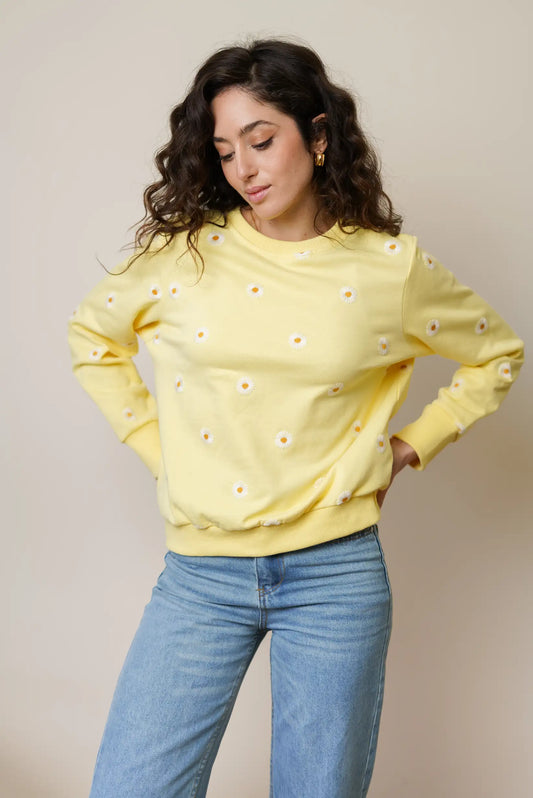 Camisa vaquera azul claro con volantes y bordados blancos románticos