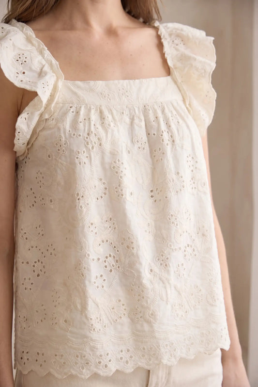 Top Mujer Beige Bordado Inglés Volantes