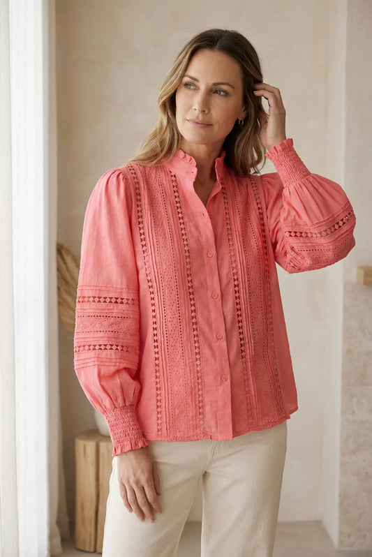 Blusa Coral Brisa manga larga calada con cuello mao primavera
