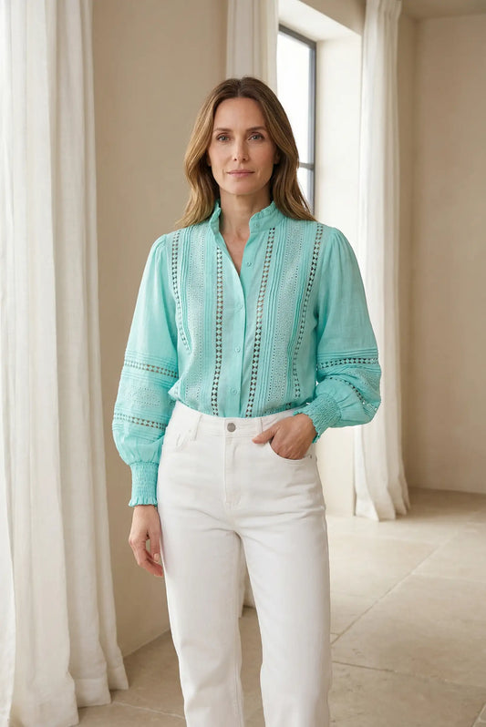 Blusa Verde Agua Brisa manga larga calada con cuello mao primavera