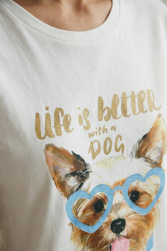 Camiseta blanca mujer algodón elástico con estampado Perrito Rosa