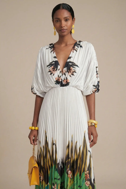 Vestido Midi Tropical Solara plisado blanco estampado verde y amarillo con escote en pico