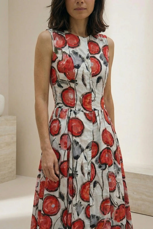 Vestido Midi Rojo Art Bloom estampado floral sin mangas primavera