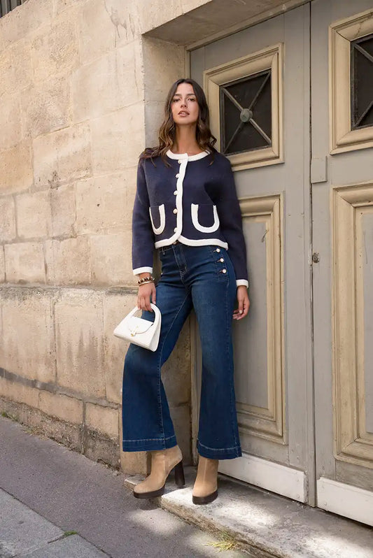 Chaqueta Azul Marino Mujer con Ribete Beige y Botones Dorados