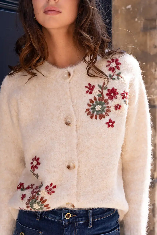 Chaqueta Mujer Beige Bordada Floral Elegante Cálida y Cómoda