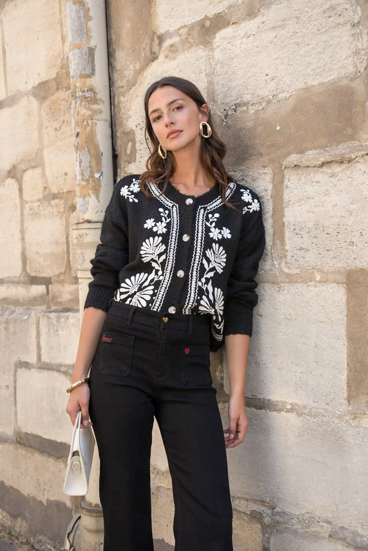 Chaqueta Negra Mujer con Bordados Florales Blancos Folk Chic