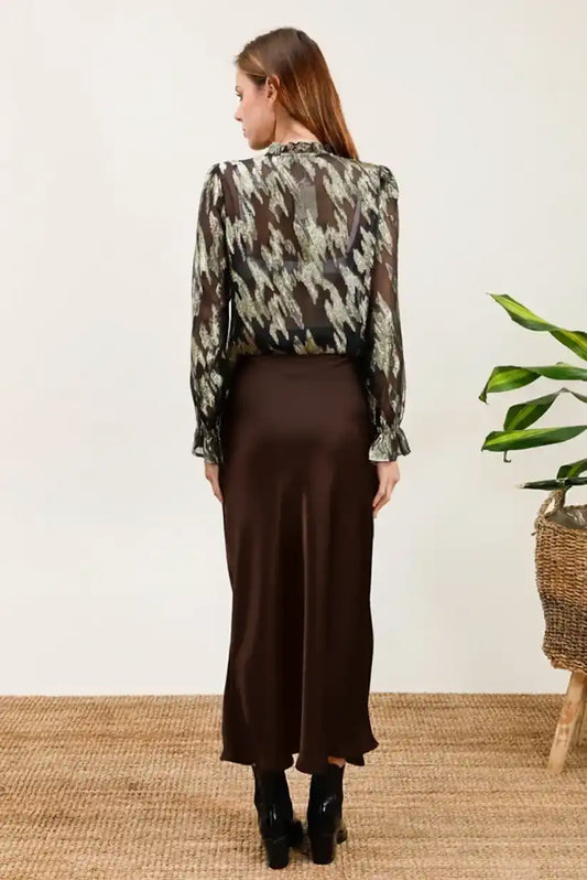 Falda Satinada Midi Animal Print Chocolate Cintura Alta Elegante