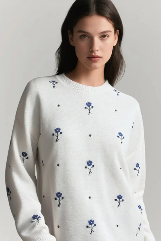 Jersey Mujer Beige Flores Azules Romántico Cálido Talla Única