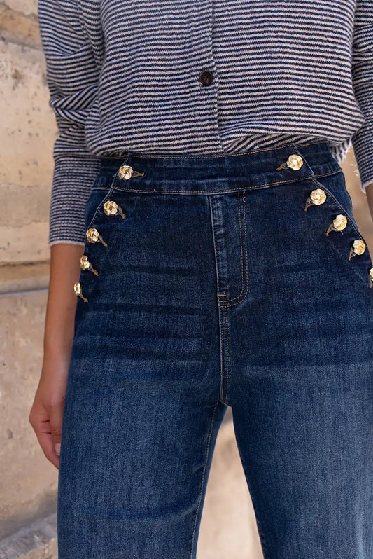 Pantalón Vaquero Campana Azul Mujer con Botones Dorados Marinero