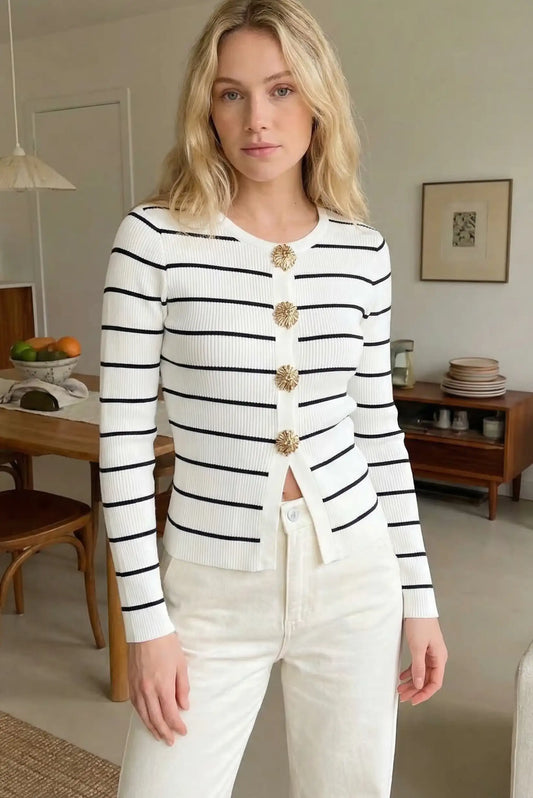 Jersey Mujer Rayas Blanco y Azul con Botones Dorados | Suéter Punto Fino