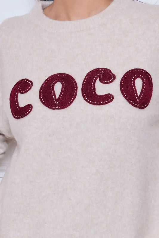 Jersey mujer cuello alto beige con corazones bordados burdeos