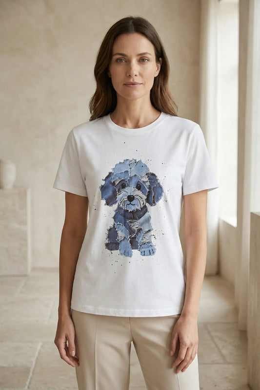 Camiseta blanca de mujer algodón elástica con estampado perrito azul