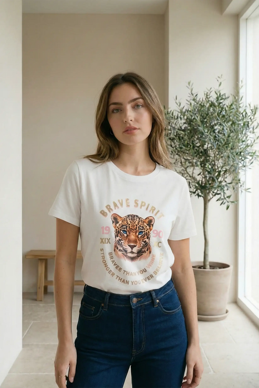 Camiseta blanca mujer algodón elástica Leopardo Brave Spirit