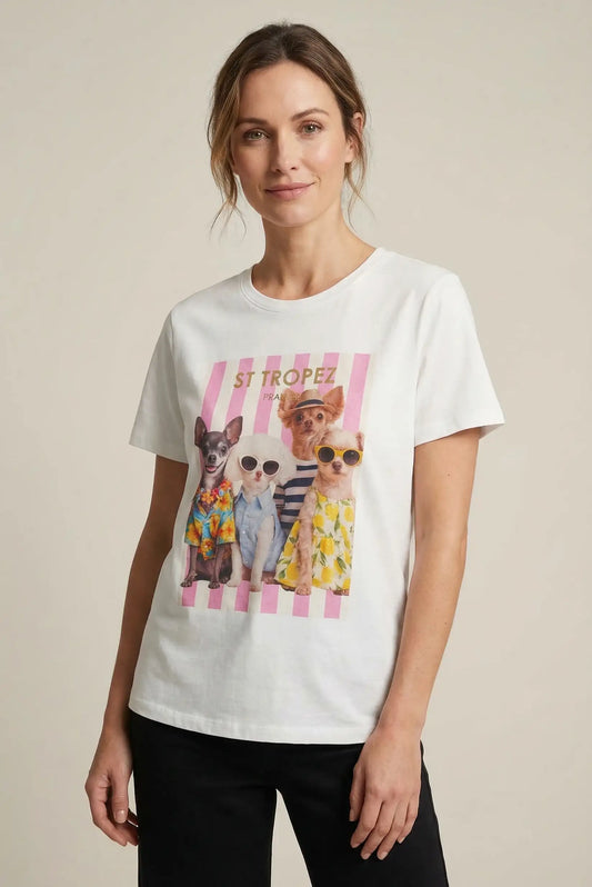 Camiseta Mujer Blanca Estampado Perros ST TROPEZ