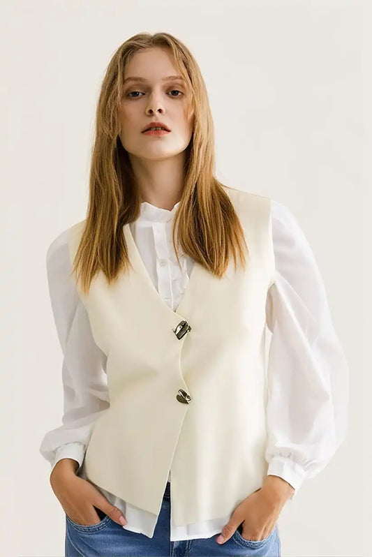 Beige Knitted Vest for Women with Gold Buttons, Elegant and Casual