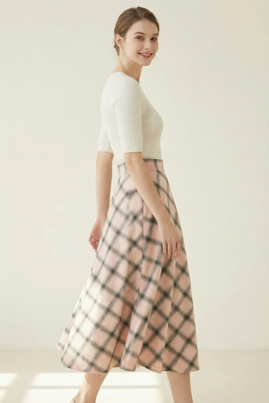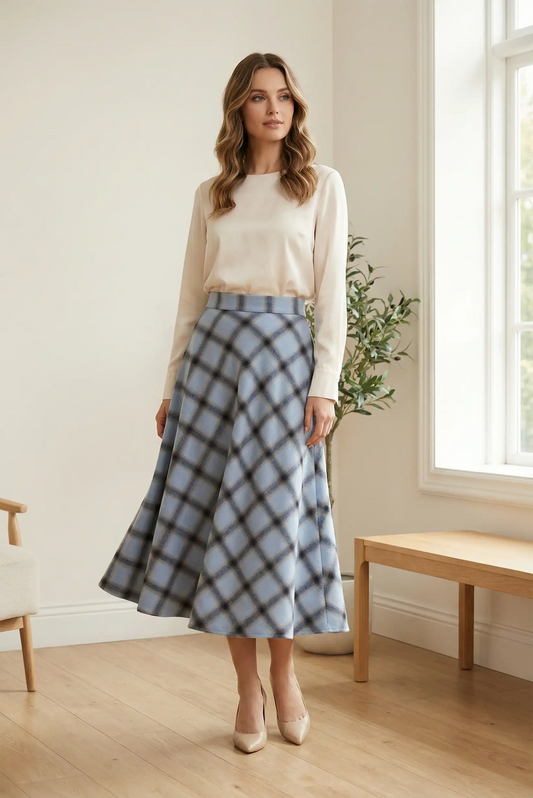 Jupe midi en coton bleu clair, à la coupe évasée et à motif à carreaux