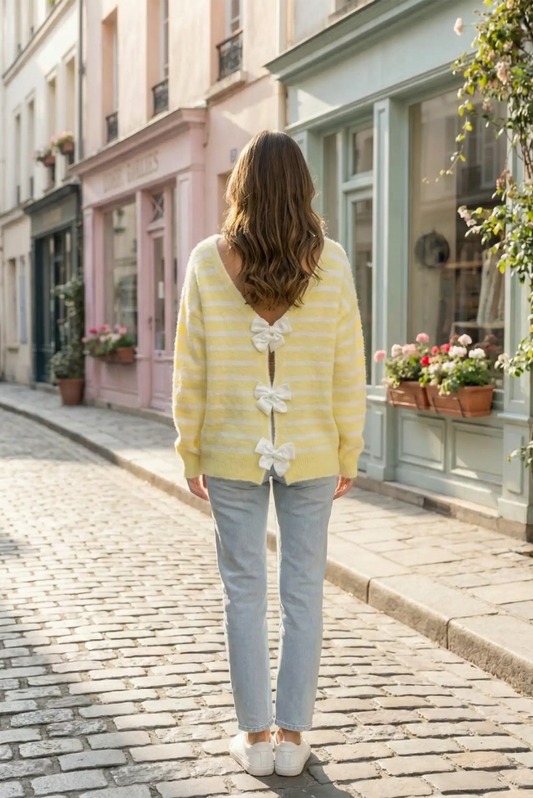 Pull rayé en maille avec ouverture au dos et liens jaune pastel