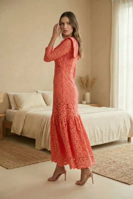 Robe longue en dentelle corail à manches trois-quarts pour une invitée à un mariage