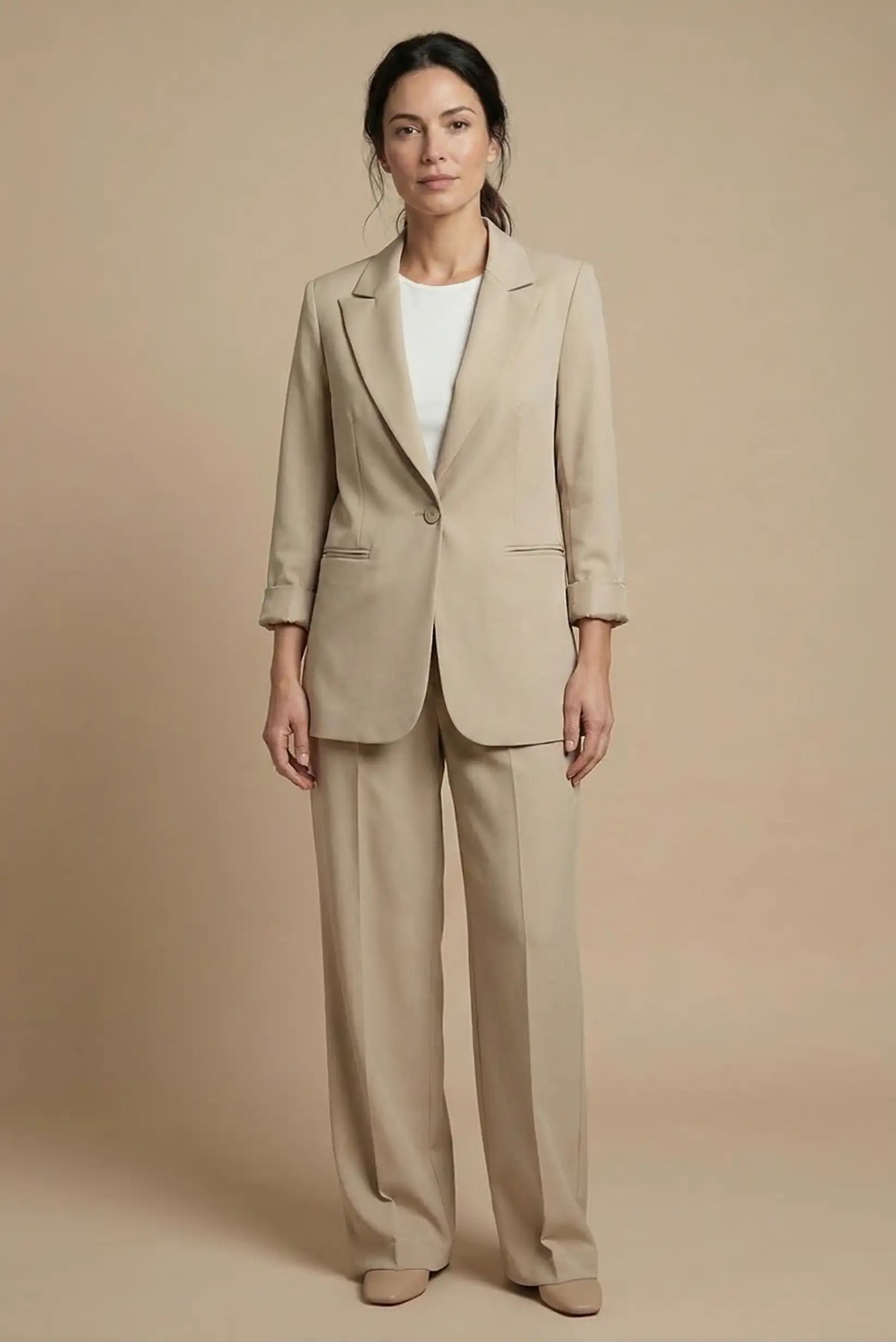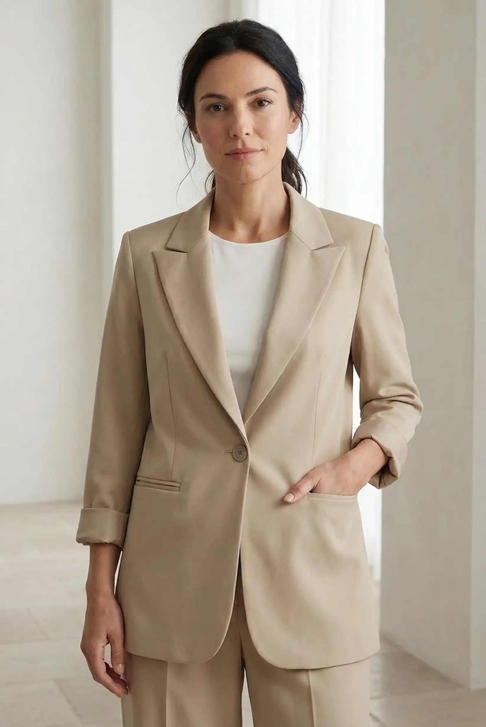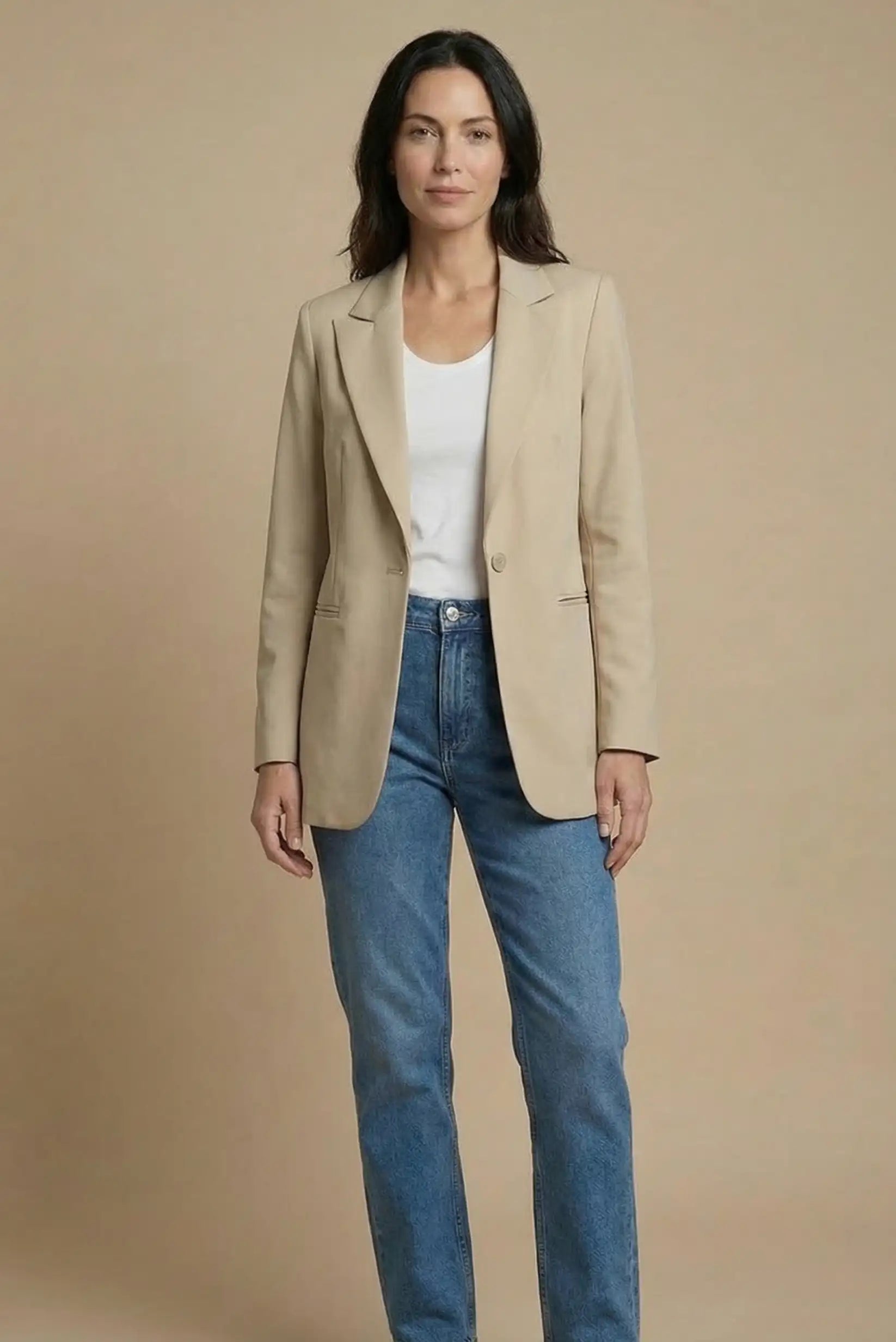 Imagina un blazer de mujer en color beige que ilumina tus días con una elegancia serena y atemporal. Esta americana versátil se adapta sin esfuerzo a tu rutina, ofreciendo estructura impecable y comodidad elástica para estilizar tu silueta con naturalidad. Es esa prenda primaveral básica que rescata cualquier "no sé qué ponerme".