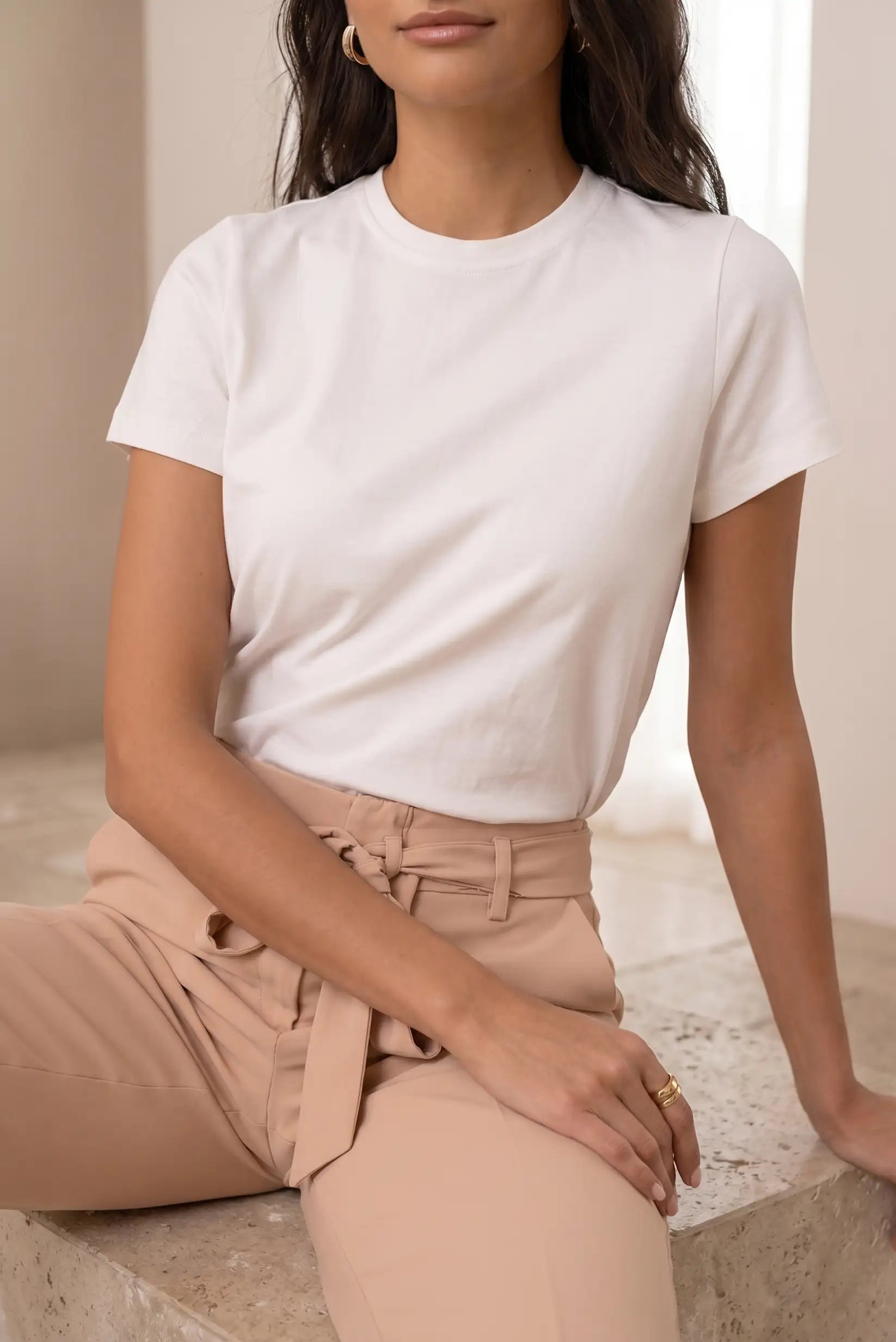 Camiseta básica de mujer en color blanco, el fondo de armario imprescindible que nunca falla y combina con absolutamente todo.
