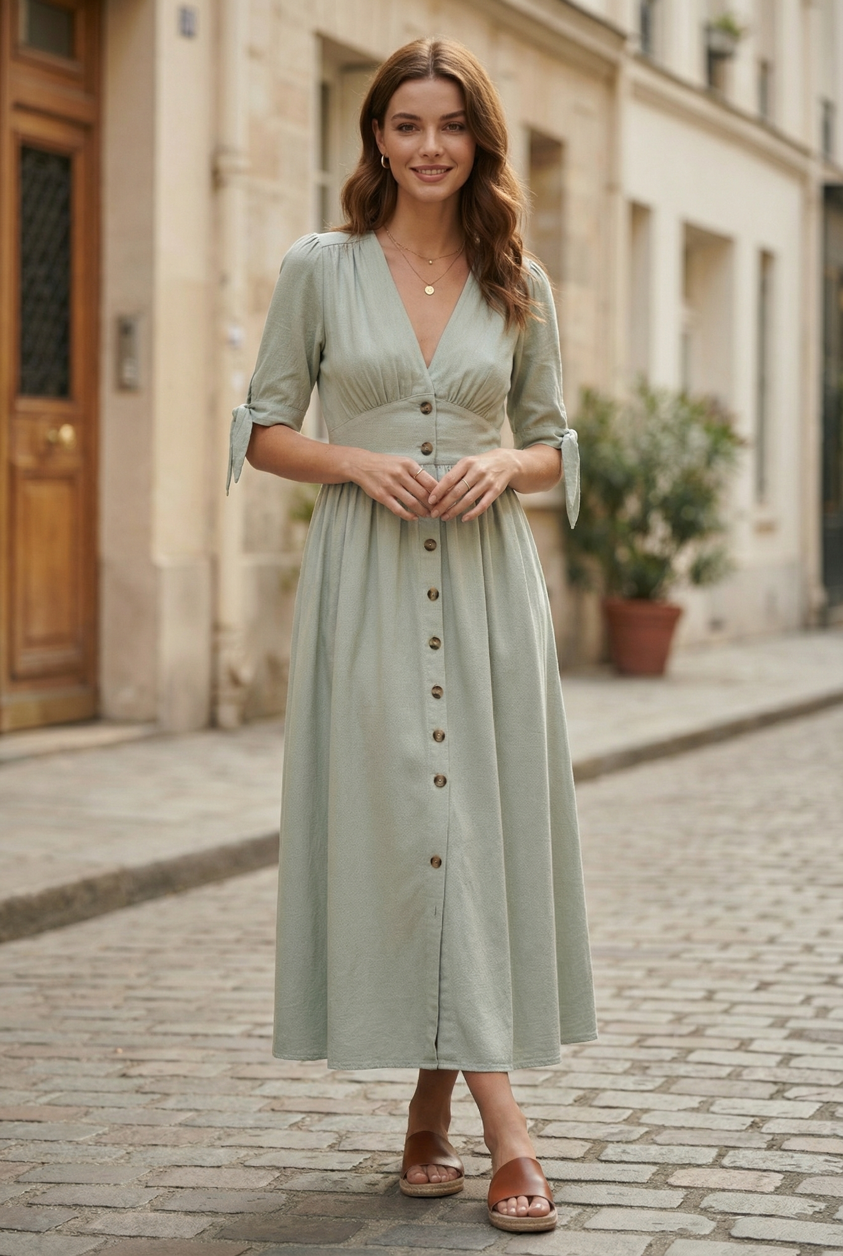 Vestido Largo Verde Salvia algodón lavado con botones y manga ajustable primavera